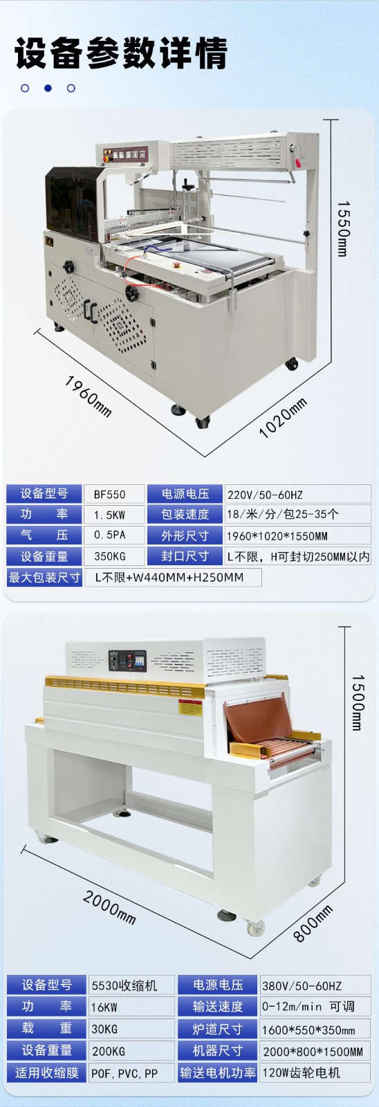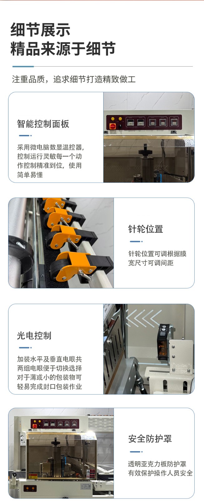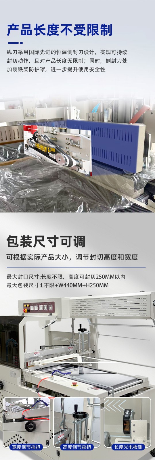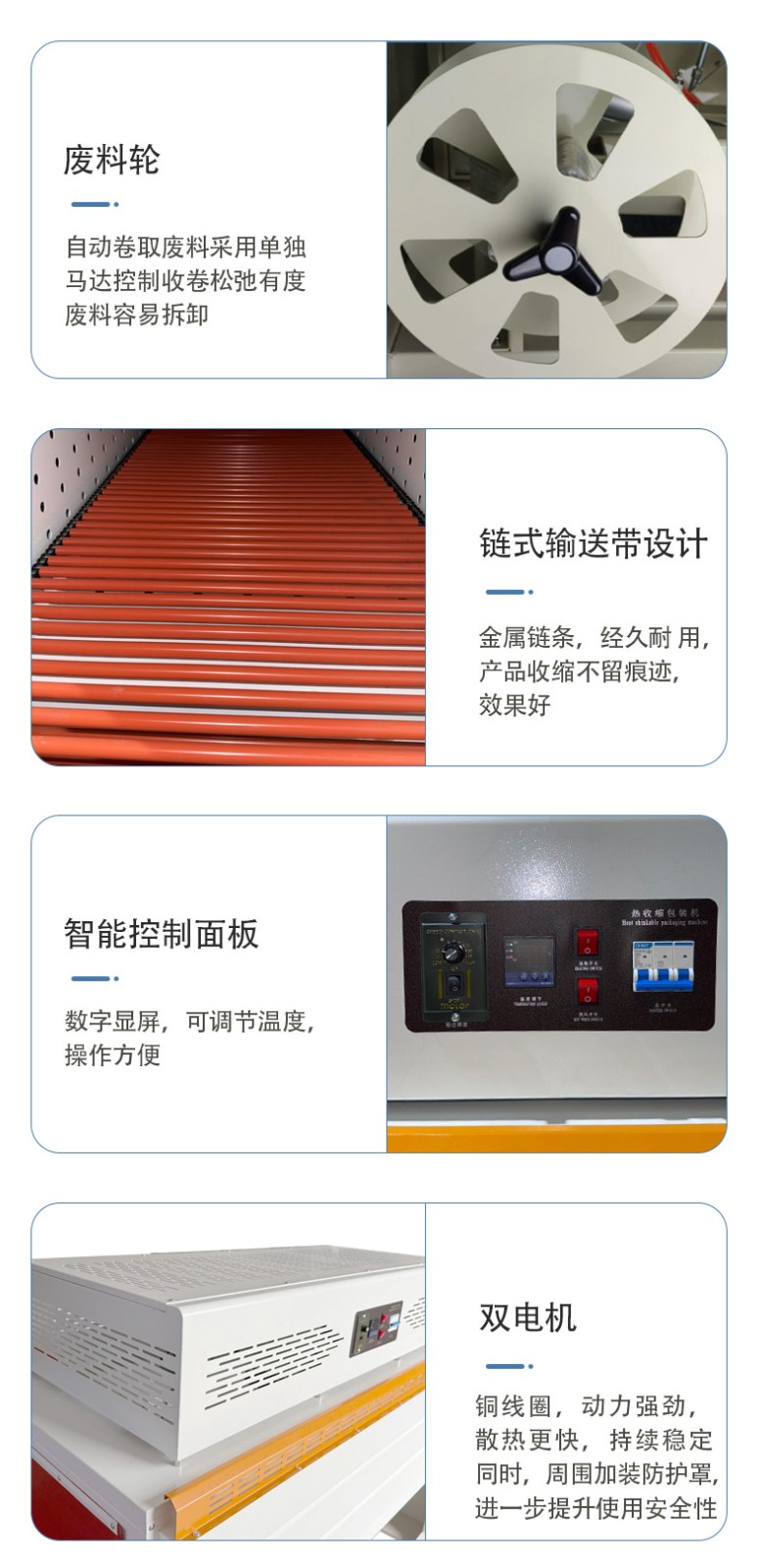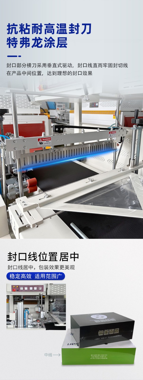 設(shè)備可自主完成 “送膜→定位產(chǎn)品→縱 / 橫封切→廢料自動回收→熱收縮隧道加熱→成品輸送” 全流程,無需人工手動送膜