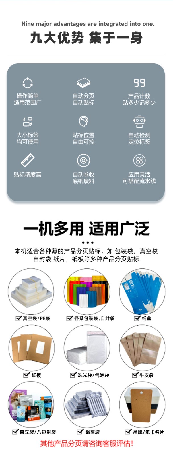 、紙袋等各種厚度各種材質(zhì)的片狀物品的自動分頁,并進(jìn)行貼標(biāo)