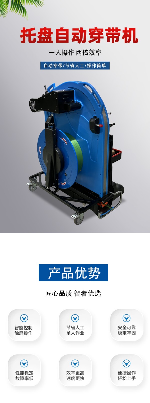相比人工捆扎(單道耗時 30-60 秒),自動托盤穿帶打包機的核心優(yōu)勢體現(xiàn)在三個維度: