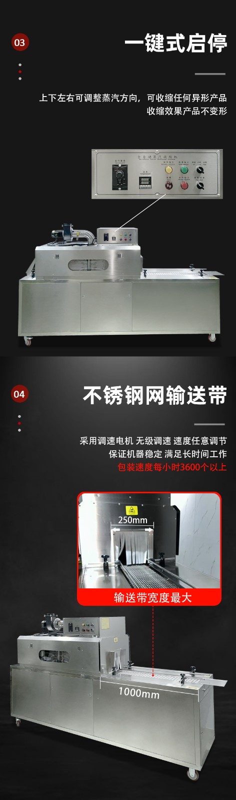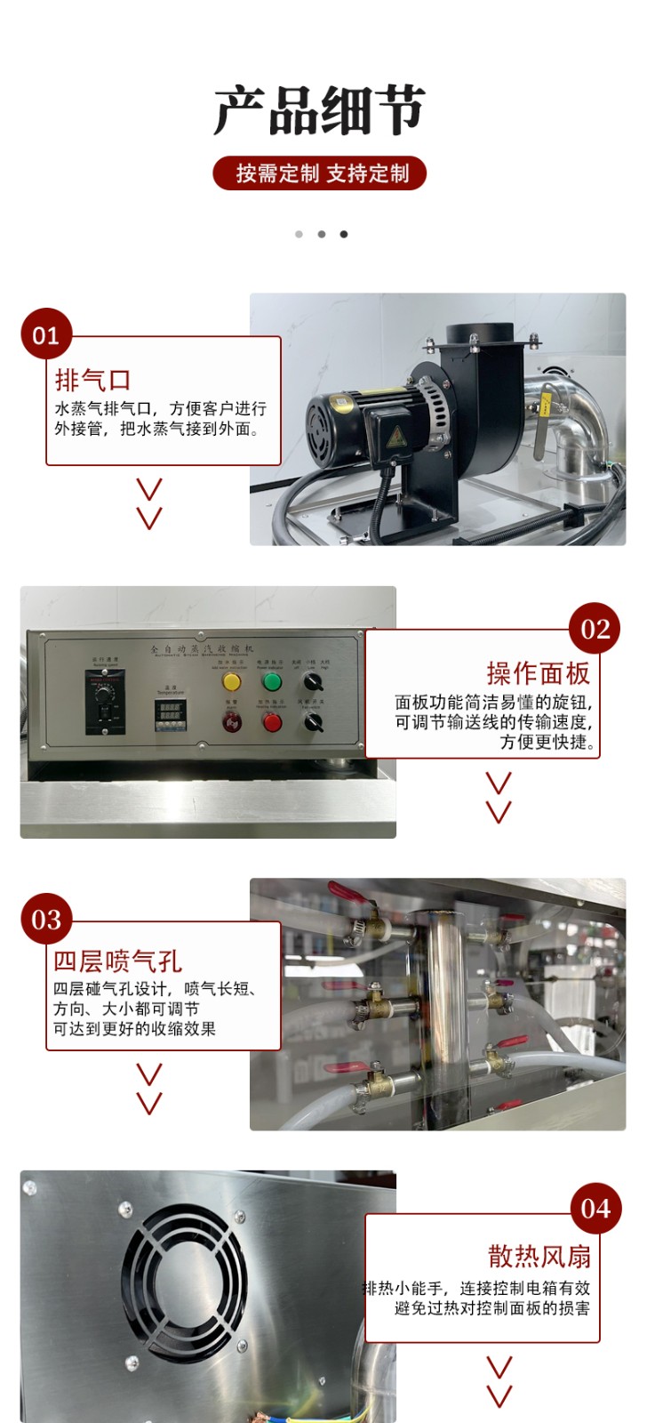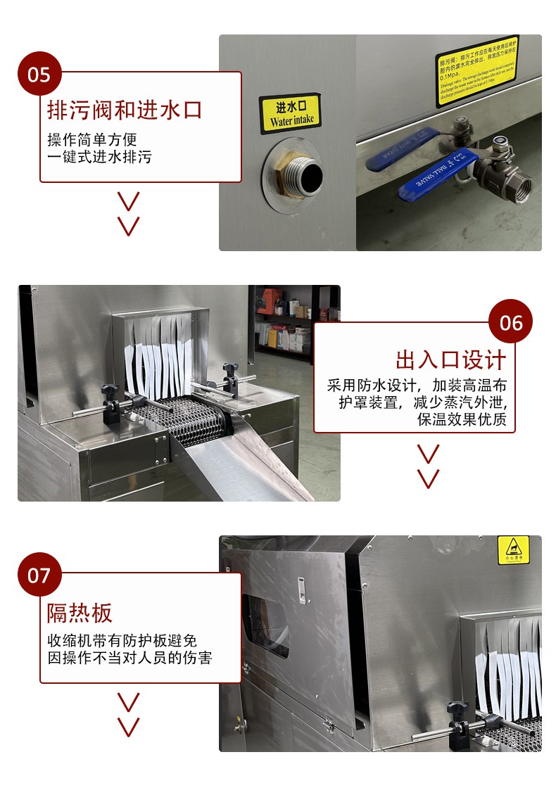 收縮通道 | 提供蒸汽作用于薄膜的封閉空間,確保加熱均勻 | 通道內(nèi)壁設(shè)導(dǎo)流結(jié)構(gòu) ,避免蒸汽局部堆積 ;部分設(shè)備可調(diào)節(jié)通道高度適配不同產(chǎn)品 |