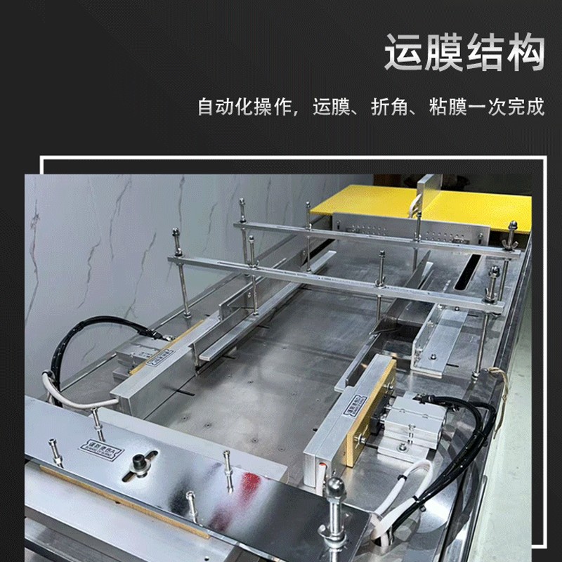 設(shè)備通過(guò) “膜料預(yù)處理→人工上料定位→三維裹膜成型→熱封切邊→折邊定型→成品輸出” 的流程
