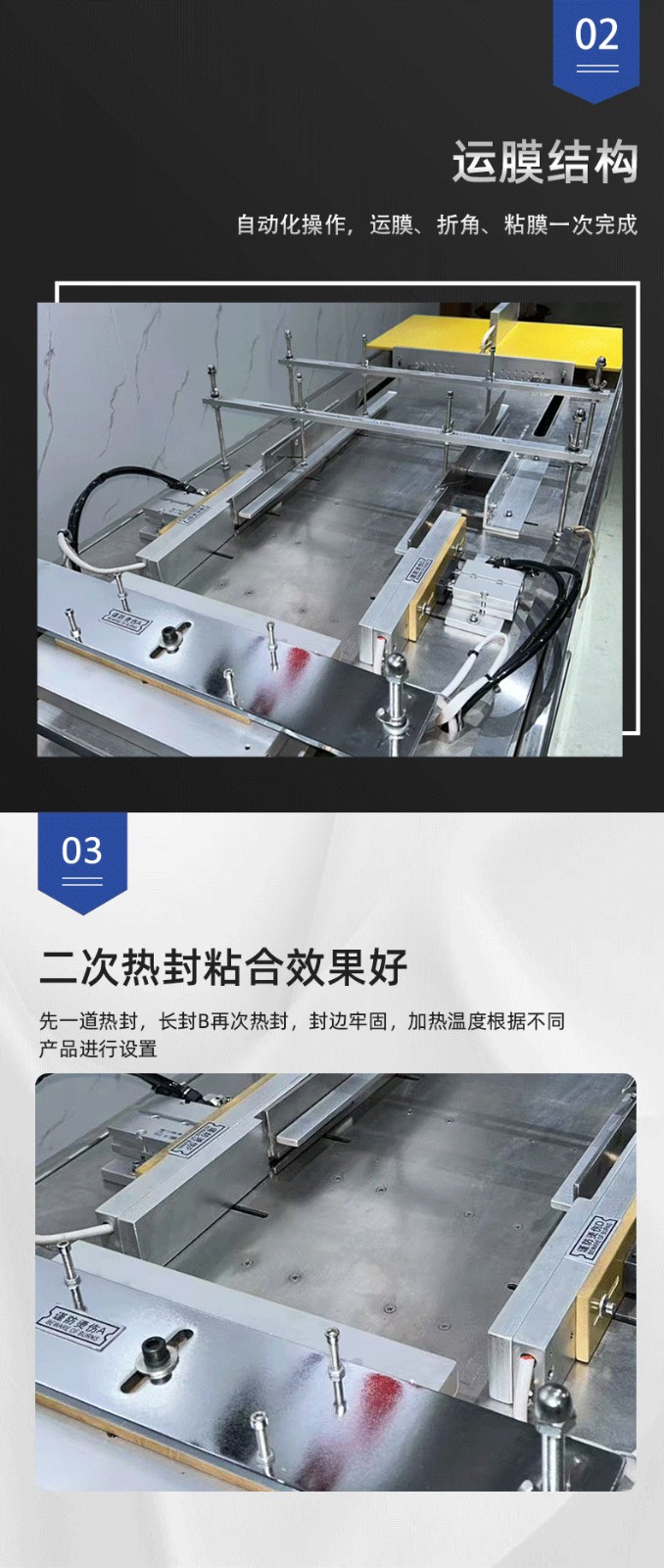,預(yù)熱裝置先對(duì)產(chǎn)品兩端的多余膜料進(jìn)行軟化(便于塑形),再通過(guò)機(jī)械折邊機(jī)構(gòu)(側(cè)折板