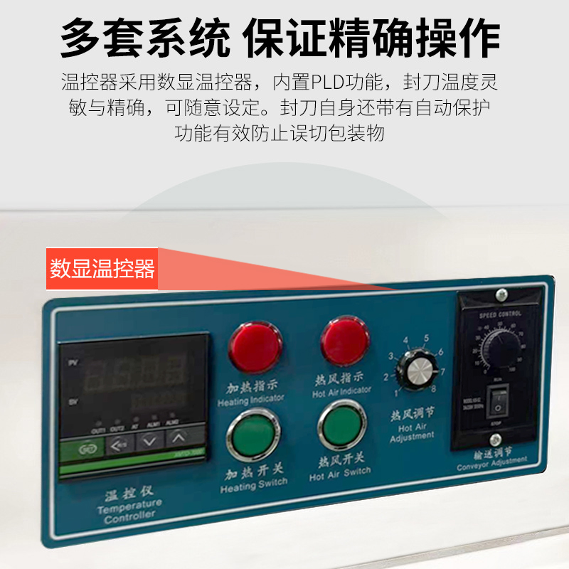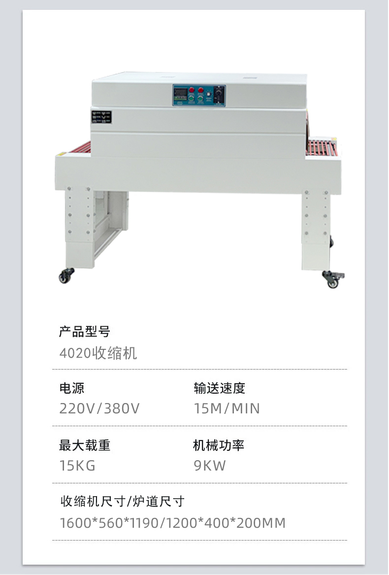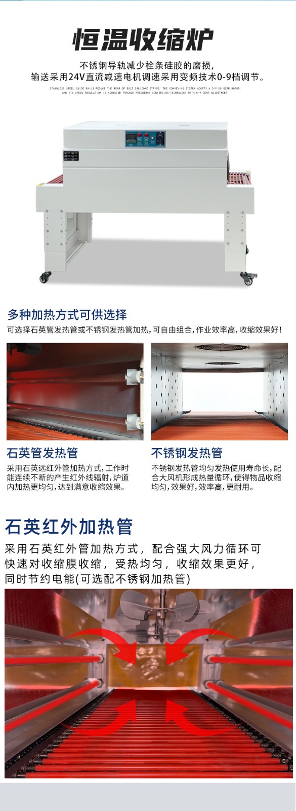 3. 熱收縮單元 | 不銹鋼爐體、加熱管(翅片式 / 紅外)、熱風(fēng)循環(huán)風(fēng)機(jī)、特氟龍輸送帶 | 實(shí)現(xiàn)膜的熱收縮定型,熱風(fēng)循環(huán)確保膜受熱均勻,特氟龍輸送帶耐高溫不粘膜 |