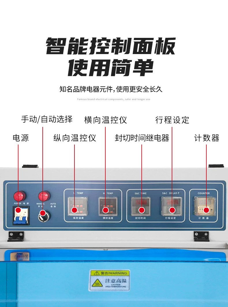 4. 電控單元 | PLC 控制系統(tǒng) 、觸摸屏、急停按鈕 、溫控儀 | 自動化控制核心:觸摸屏設(shè)定參數(shù)(速度 、溫度、封切時(shí)間) ,PLC 協(xié)調(diào)各單元動作 ,溫控儀精準(zhǔn)控溫 |