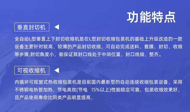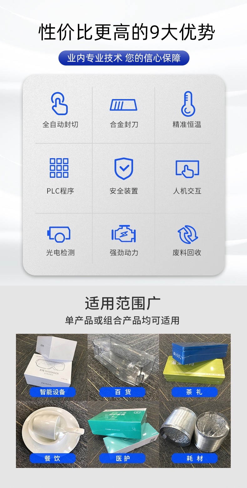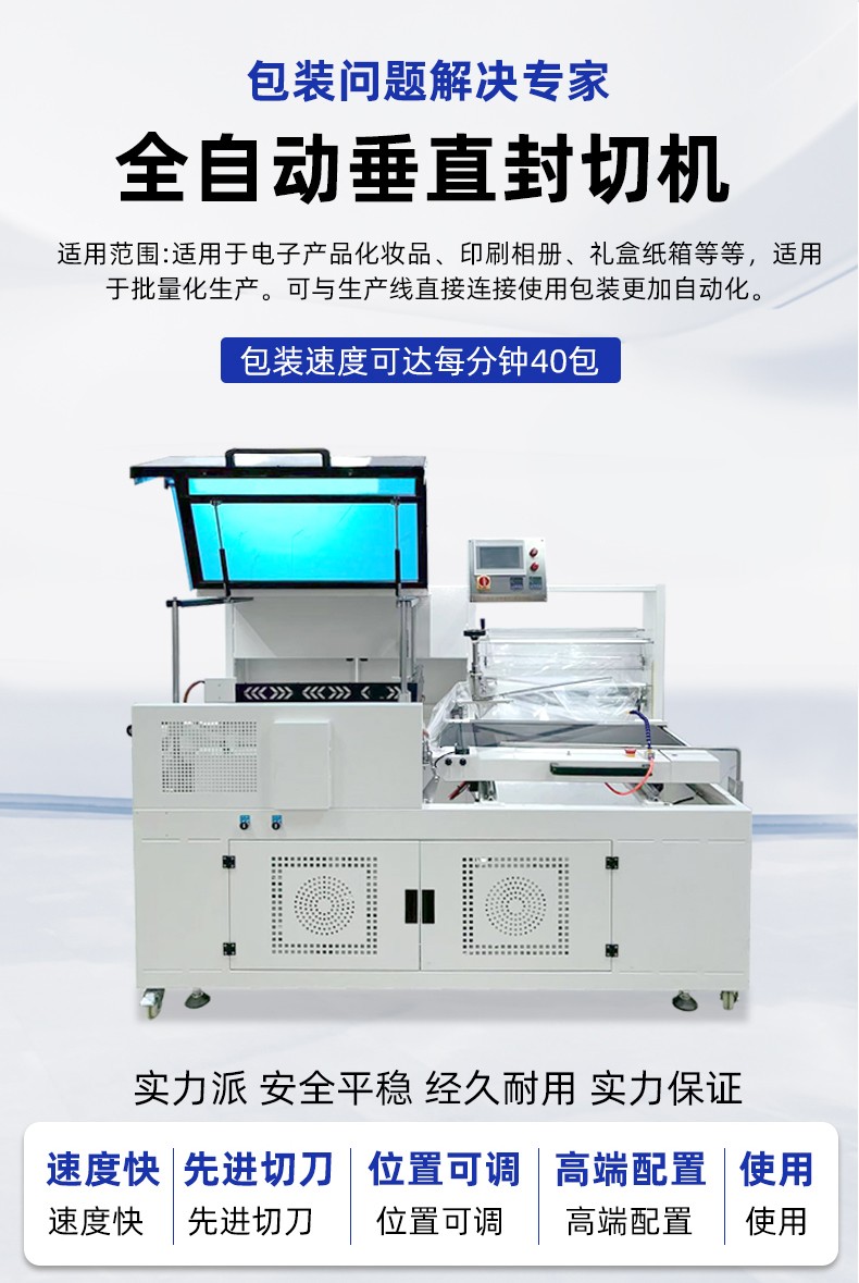 適配性更強 | - 支持 “多尺寸產(chǎn)品混線包裝”:無需頻繁更換模具 ,僅需通過觸摸屏調(diào)整封切高度、收縮參數(shù),即可適配從小型零件(如數(shù)據(jù)線)到大型禮盒(如月餅盒)的產(chǎn)品; - 兼容異形產(chǎn)品:對帶弧度 、凸起的產(chǎn)品(如洗發(fā)水、玩具) ,垂直封切可避免膜材拉扯變形 ,收縮后貼合度更高。 |