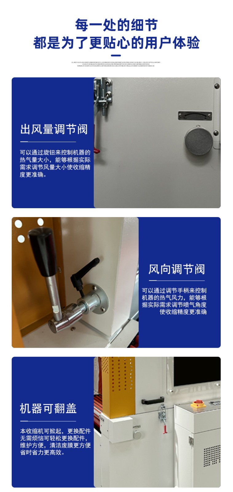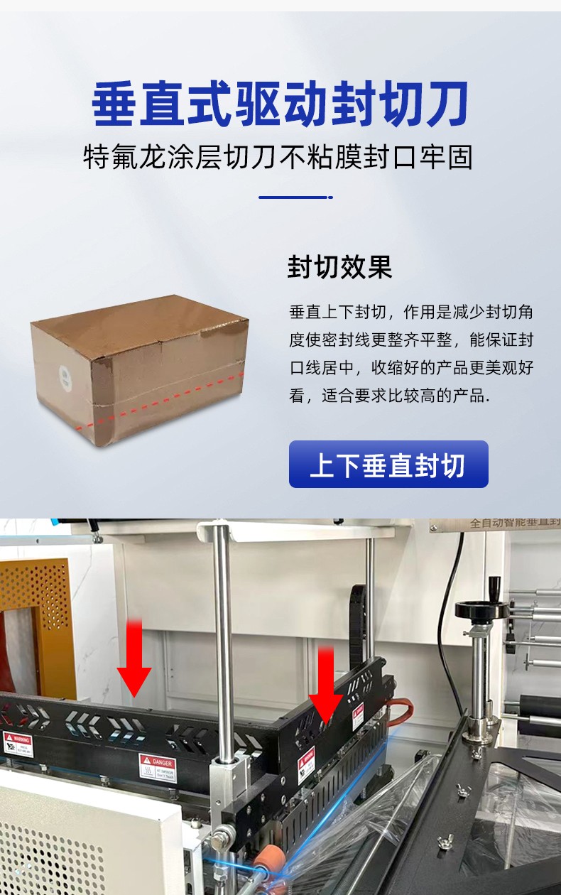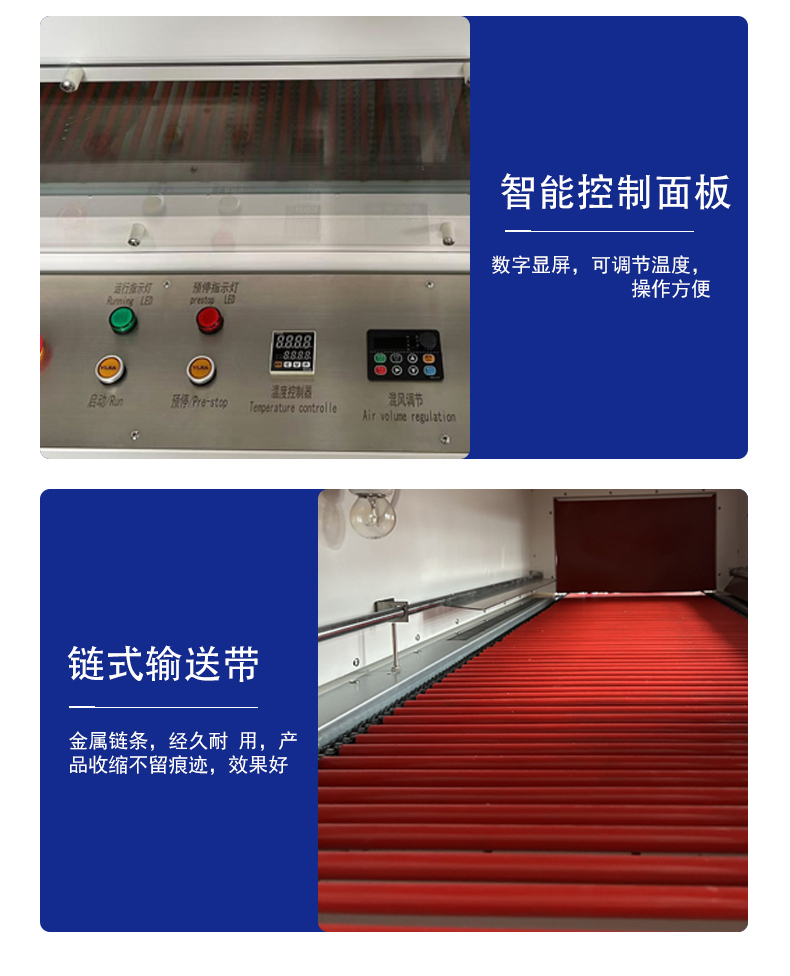 包裝更穩(wěn)定 | - 封切質(zhì)量高:垂直封切刀受力均勻 ,膜邊封合緊密 、無漏封,避免因封切不牢導(dǎo)致的膜材脫落 ; - 收縮均勻:熱風(fēng)循環(huán)系統(tǒng)確保通道內(nèi)溫度無死角 ,膜材收縮后無氣泡、無褶皺 ,外觀規(guī)整(尤其適合醫(yī)藥 、美妝等對包裝顏值要求高的行業(yè))。 |